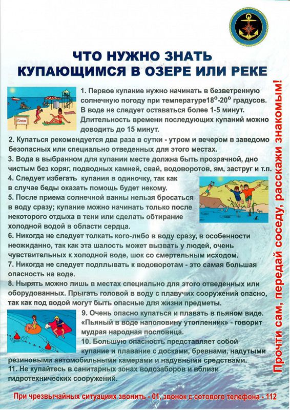 Поведение на воде 03 июня 2025 Наступил долгожданный купальный сезон. Сотни жителей устремляются в выходные дни поближе к воде. Свежий воздух, солнце, купание не только доставляют удовольствие, но и служат хорошим средством закаливания организма. Вместе с этим вода регулярно уносит жизни. Помните: купание в нетрезвом виде может привести к трагическому исходу! При купании недопустимо: Плавать в незнакомом месте, под мостами и у плотин. Нырять с высоты, не зная глубины и рельефа дна. Заплывать за буйки и ограждения. Приближаться к судам, плотам и иным плавсредствам. Прыгать в воду с лодок, катеров, причалов. Хватать друг друга за руки и ноги во время игр на воде. Избегайте употребление алкоголя до и во время нахождения в воде или у береговой линии. Алкоголь ухудшает чувство равновесия, координацию движений и самоконтроль. Не умеющим плавать купаться только в специально оборудованных местах глубиной не более 1-2 метра! КАТЕГОРИЧЕСКИ ЗАПРЕЩАЕТСЯ купание на водных объектах, оборудованных предупреждающими аншлагами «КУПАНИЕ ЗАПРЕЩЕНО!». Помните! Только неукоснительное соблюдение мер безопасного поведения на воде может предупредить беду.