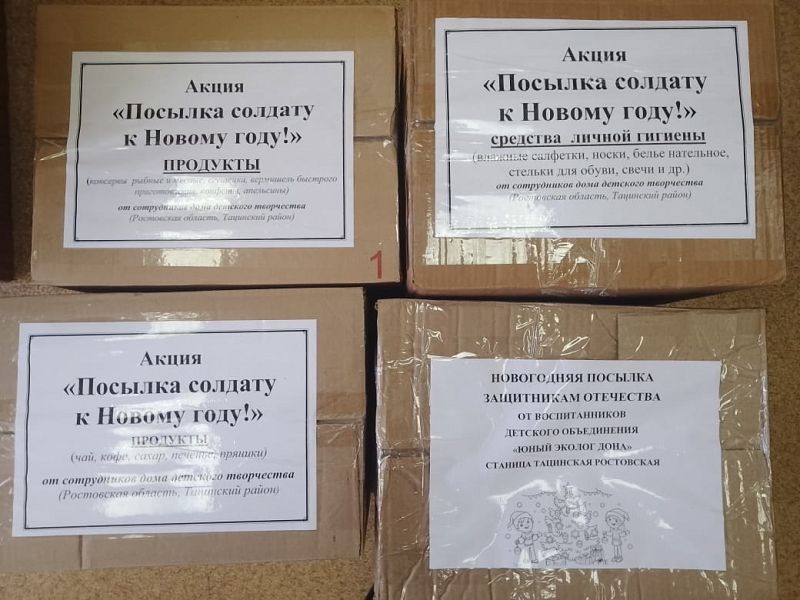 Акция «Посылка солдату к Новому году!» 18 декабря 2024 В доме детского творчества в период с 1 по 17 декабря прошла патриотическая акция «Посылка солдату к Новому году!». Гуманитарную помощь (сладости, фрукты, чай, кофе, консервы, средства личной гигиены и др.) передали в штаб поддержки участников СВО. В акции участвовали обучающиеся детских объединений «Грация» (педагог дополнительного образования Гарная Н.С.), «Ладья» (педагог дополнительного образования Макаренко М.М.), «Юный художник» (педагог дополнительного образования Бочарова Я.Т.), «Юный эколог Дона» (педагог дополнительного образования Шапкина С.Ю.), «Математический калейдоскоп» (педагог дополнительного образования Зимовейская Н.А.), «Мир фантазий» (педагог дополнительного образования Савицкая Н.В.), «Радуга» (педагог дополнительного образования Мельниченко С.Н.), «Увлекательный английский» (педагог дополнительного образования Арутюнян М.В.), «Фиеста» (педагог дополнительного образования Петрова Н.А.), «Волшебница» (педагог дополнительного образования Бойко Т.Н.) и сотрудники организации. Дети написали письма поддержки и поздравления с наступающим Новым годом и скорейшего возвращения домой.