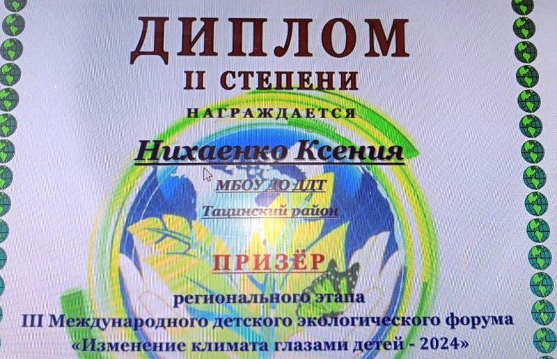 Итоги Регионального этапа III Международного детского экологического форума 04 июня 2024 Подведены итоги Регионального этапа III Международного детского экологического форума «Изменение климата глазами детей – 2024». Победители муниципального этапа представляли на региональный этап форума рисунки, посвященные проблеме изменений климата, их последствиям для природы и людей, а также способам адаптации к ним, репортажи об экологических проблемах, коллекции моделей одежды из вторсырья и отходов, поделки и композиции из вторсырья и отходов. Региональное жюри высоко оценило работы наших детей. Призерами в номинации «Рисунки» по возрастным категориям стали: 13-17 лет Логвинова Анастасия МБОУ Тацинская СОШ №3 3 Степанов Иван МБОУ Тацинская СОШ№2 2 Ушакова Вероника МБОУ Быстрогорская СОШ 2 3-6 лет Письменский Алексей МБДОУ Тацинский д/с «Колокольчик» 1 В номинации «Экоблогер» 2 место заняла Нихаенко Ксения из МБОУ Быстрогорской СОШ. Работы занявшие первые места будут направлены для участия во всероссийском этапе экологического форума.