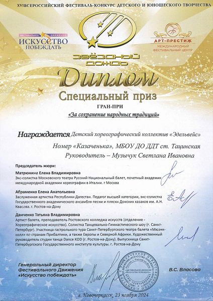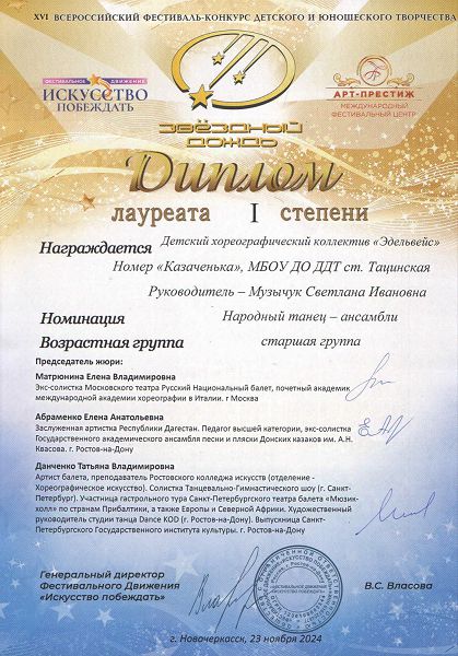Участие в XVI Всероссийском фестивале-конкурсе «Звёздный дождь» 25 ноября 2024 23 ноября юные артисты из детских объединений «Аллегро» и «Эдельвейс» Дома детского творчества приняли участие в XVI Всероссийском фестивале-конкурсе «Звёздный дождь», который проходил в городе Новочеркасске, среди десятков коллективов с юга России. Конкурс был разделён на несколько номинаций: Инструментальное исполнительство: духовые и ударные инструменты, народные инструменты, фортепиано, струнные инструменты, эстрадные инструменты и ВИА. Вокал: академическое пение, народное пение, эстрадное пение, джазовое пение и патриотическая песня. Хореография: народный, народно-стилизованный, классический, современный, бальный, патриотический, эстрадный, детский танец, фольклор и танцевальное шоу. Хоры. DanceSolo. Театр моды. Вокальные ансамбли «Аллегро Мини», «Аллегро Джуниор» и солист Максаков Денис показали высокие результаты, став лауреатами 2 степени. Солистка Рожко Аксинья была удостоена звания Лауреата 1 степени. Обучающиеся детского объединения «Эдельвейс» выступили с хореографическим номером «Казаченька», который был удостоен диплома Лауреата 1 степени и специального приза Гран-при «За сохранение народных традиций». Дуэт педагогов «Дайджест» принял участие в конкурсе заочно, и результаты будут известны в течение 10 дней. Поздравляем юных артистов и их педагогов!